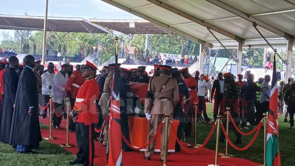 The ceremony begins with both Kenya's and East Africa's National Anthems after the casket is placed at the centre of the Mamboleo grounds.