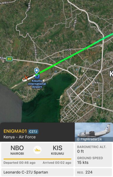 The military aircraft carrying the casket bearing the remains of the late former Prime Minister Raila Odinga lands at the Kisumu International Airport.