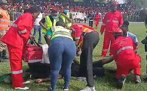 Medical personnel attend to emotionally overwhelmed mourners who fainted after viewing Raila Odinga's remains at the Mamboleo grounds in Kisumu.