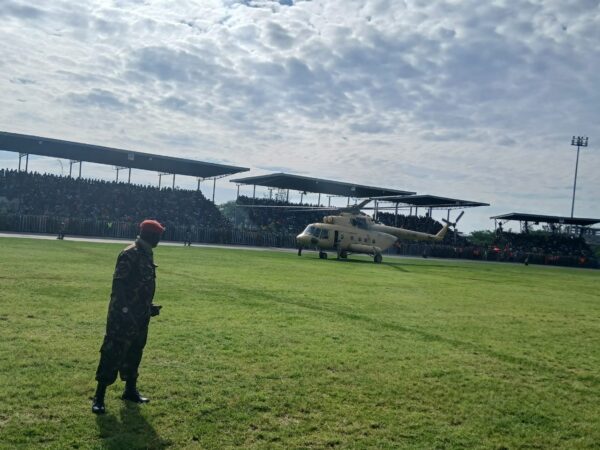 The military chopper bearing the remains of Raila leaves the Kisumu International Airport for the Mamboleo grounds in Kisumu.