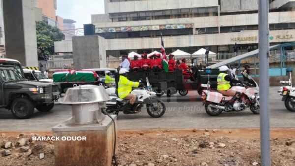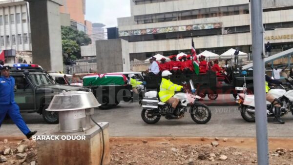 The military gun carriage bearing the remains of the late Prime Minister Raila Odinga arrives at the Parliament Buildings as it lies in state for a brief body viewing before it is taken to the Nyayo National Stadium for the State Funeral service.