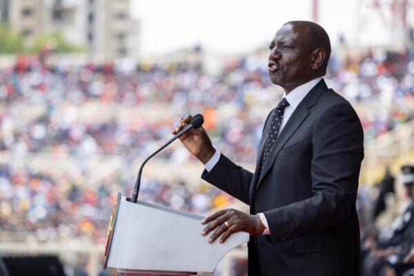 President William Ruto takes to the podium to address the mourners at the Nyayo National Stadium.