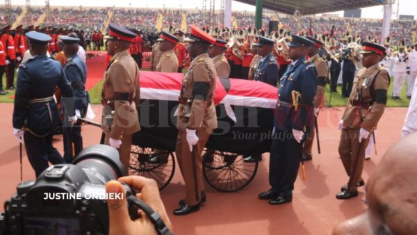 The military gun carriage carrying the remains of the late former Prime Minister Raila Odinga arrives at the Nyayo Stadium for the State Funeral service amid wailing by thousands of mourners.