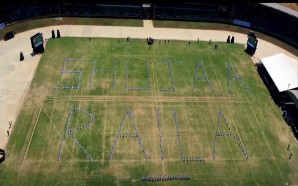 Schoolchildren then took centre stage, brightening the stadium with choreographed routines and poetry performances.