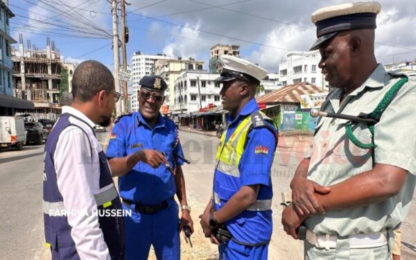 County Chief Officer for Transport and Infrastructure, Engineer Ali Shariff, with Coast Regional Traffic Enforcement Officer George Kashmir at Saba Saba junction. (Photo: Farhiya Hussein)