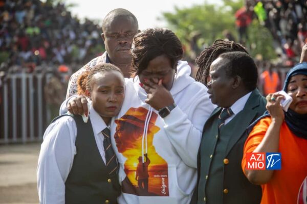 The crowd, waving Kenyan flags and holding white handkerchiefs and twigs, erupted into tears and song as the military aircraft carrying Raila’s remains touched down at the stadium.